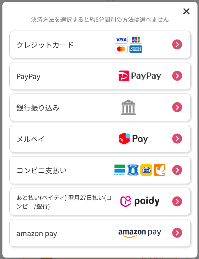 オリくじの支払方法は「クレジットカード」を含め7種類の支払い方法があります。