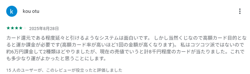 カード還元である程度延々と引けるようなシステムは面白いです。 しかし当然くじなので高額カード目的となると運か課金が必要です(高額カード率が高いほど1回の金額が高くなります)。 私はコツコツ派ではないので約6万円課金して2種類ほどやりましたが、現在の売値でいうと計8千円程度のカードが当たりました。これでも多少なり運がよかったと思うことにします。
