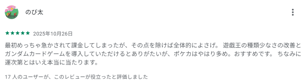 最初めっちゃ急かされて課金してしまったが、その点を除けば全体的によさげ。 遊戯王の種類少なさの改善とガンダムカードゲームを導入していただけるとありがたいが、ポケカはやはり多め。おすすめです。 ちなみに運次第とはいえ本当に当たります。