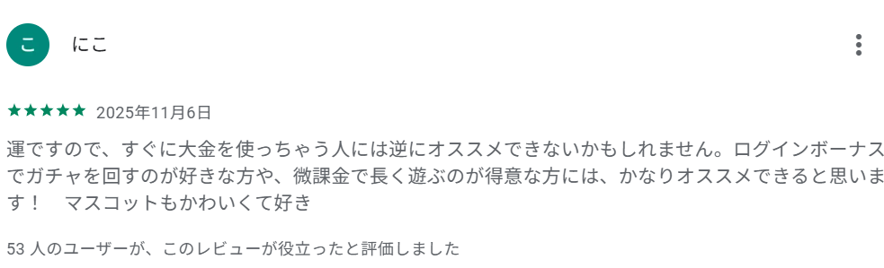 運ですので、すぐに大金を使っちゃう人には逆にオススメできないかもしれません。ログインボーナスでガチャを回すのが好きな方や、微課金で長く遊ぶのが得意な方には、かなりオススメできると思います! マスコットもかわいくて好き