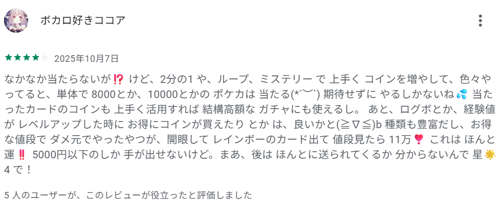 なかなか当たらないが⁉️ けど、2分の1 や、ループ、ミステリー で 上手く コインを増やして、色々やってると、単体で 8000とか、10000とかの ポケカは 当たる(*´︶`) 期待せずに やるしかないね💦 当たったカードのコインも 上手く活用すれば 結構高額な ガチャにも使えるし。 あと、ログボとか、経験値が レベルアップした時に お得にコインが買えたり とか は、良いかと(≧∇≦)b 種類も豊富だし、お得な値段で ダメ元でやったやつが、開眼して レインボーのカード出て 値段見たら 11万❣️ これは ほんと 運‼️ 5000円以下のしか 手が出せないけど。まあ、後は ほんとに送られてくるか 分からないんで 星🌟 4 で!