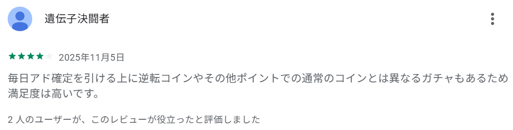 毎日アド確定を引ける上に逆転コインやその他ポイントでの通常のコインとは異なるガチャもあるため満足度は高いです。
